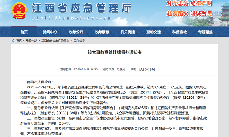 2025 年 12 月 31 日 22 时 25 分许,江西省南昌市进贤县江西隆莱生物制药有限公司发生一起窒息事故,造成 3 人死亡、3 人受伤,该事故被江西省安委会列为较大事故并挂牌督办,以下为截至 2026 年 1 月 14 日的详细情况。