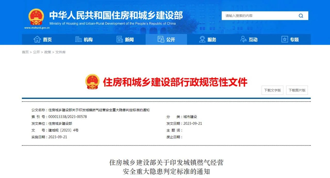 为指导各地加强城镇燃气安全风险管控和隐患排查治理,防范重特大事故发生,切实保护人民群众生命财产安全,近日,住房城乡建设部印发《城镇燃气经营安全重大隐患判定标准》。